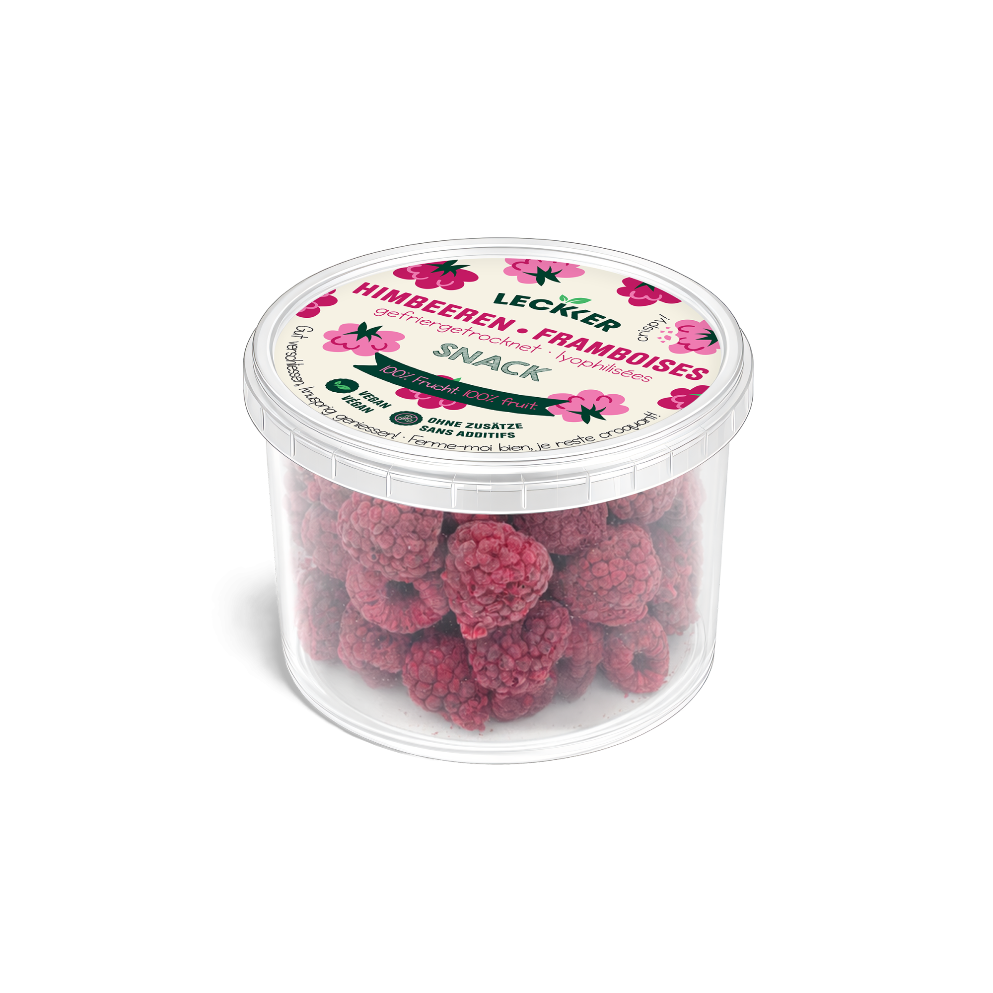 Box with 18 x 25g freeze-dried raspberries.
